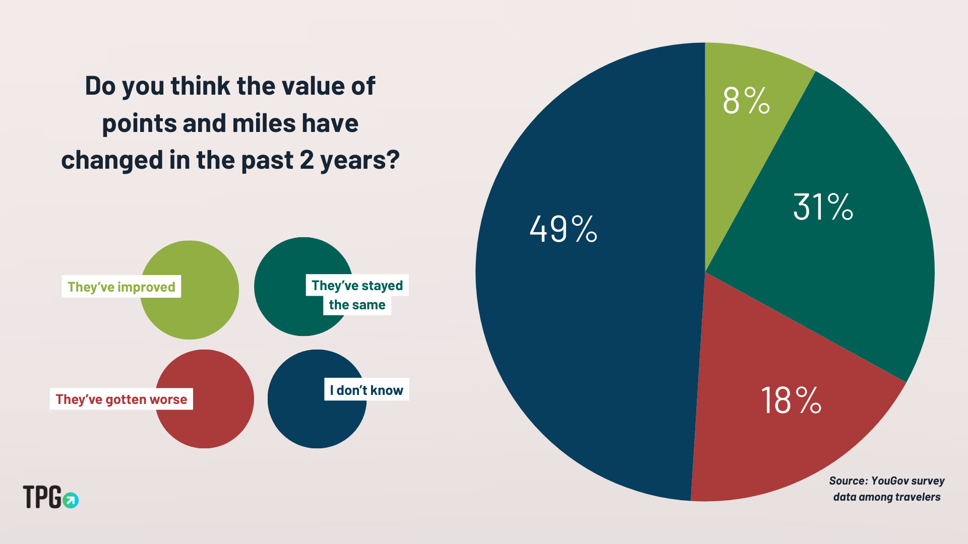 We also specifically asked about the value of points and miles over time, which aligned better with expectations. Only 8% of all flyers said the value had increased in the past few years; 25% said the value stayed the same, and 18% said it had dropped.